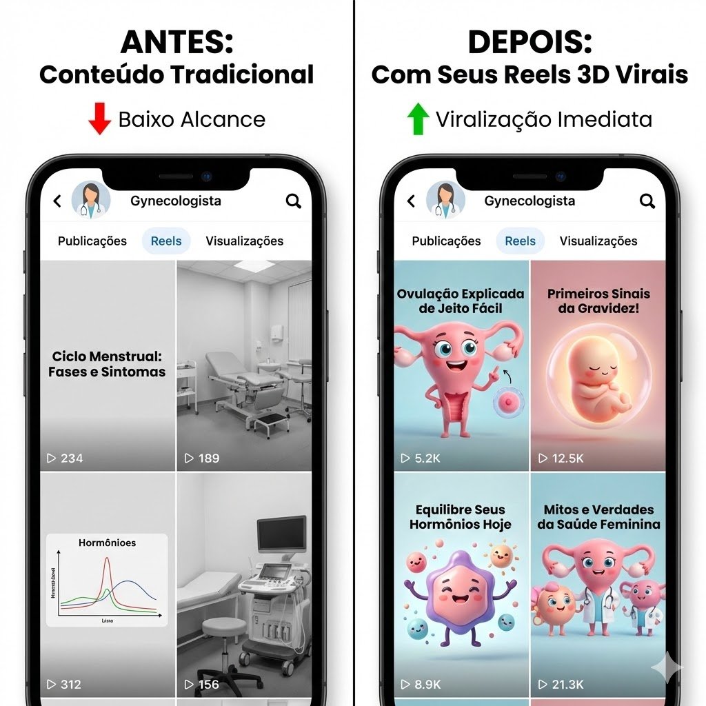 50 Reels com personagens antropomórficos de ginecologia e obstetrícia, criados para educar, gerar confiança e viralizar, sem necessidade de se gravar ou se expor na câmera.